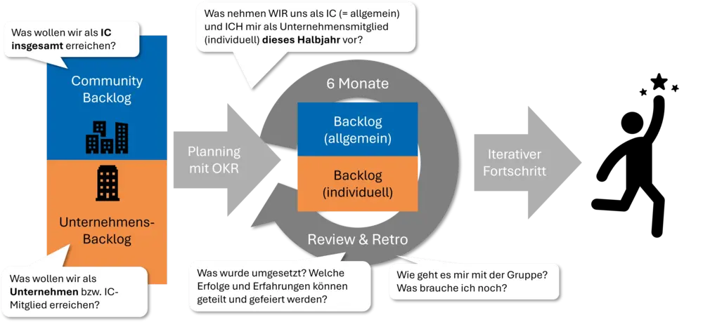 Herzstück der IC ist die duale Projektstruktur in 6-Monats-Zyklen: Jedes aktive Mitglied arbeitet sowohl an einem gemeinsamen Community-Projekt als auch an einem individuellen Integrationsprojekt im eigenen Unternehmen. In regelmäßigen Online- und Präsenztreffen teilen die Mitglieder Erfahrungen, Herausforderungen und Erkenntnisse, und unterstützen sich in den Projekten.