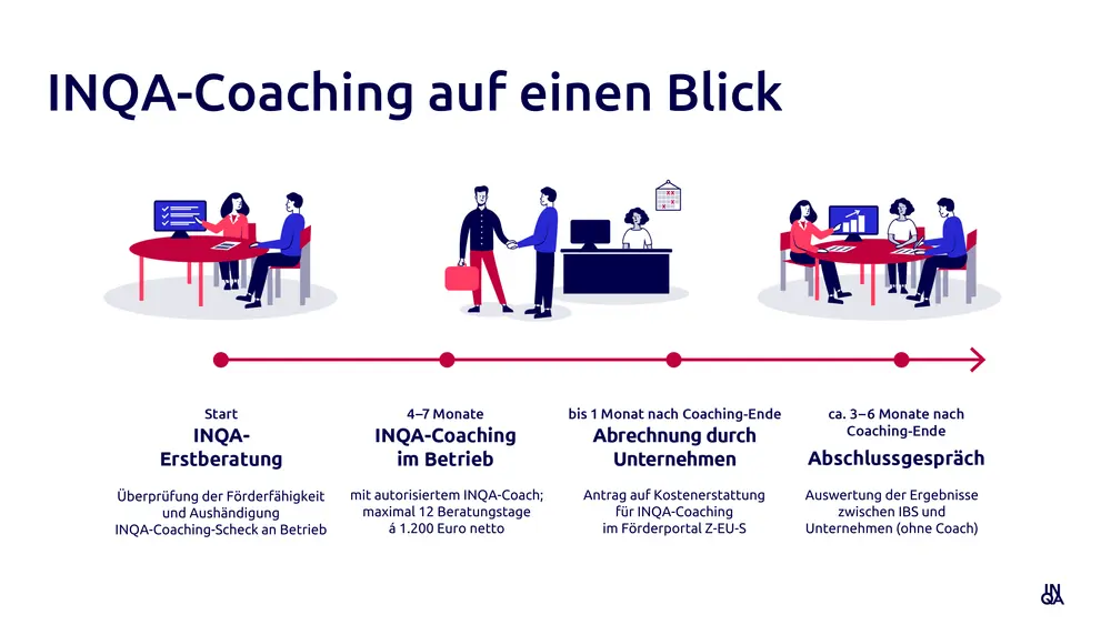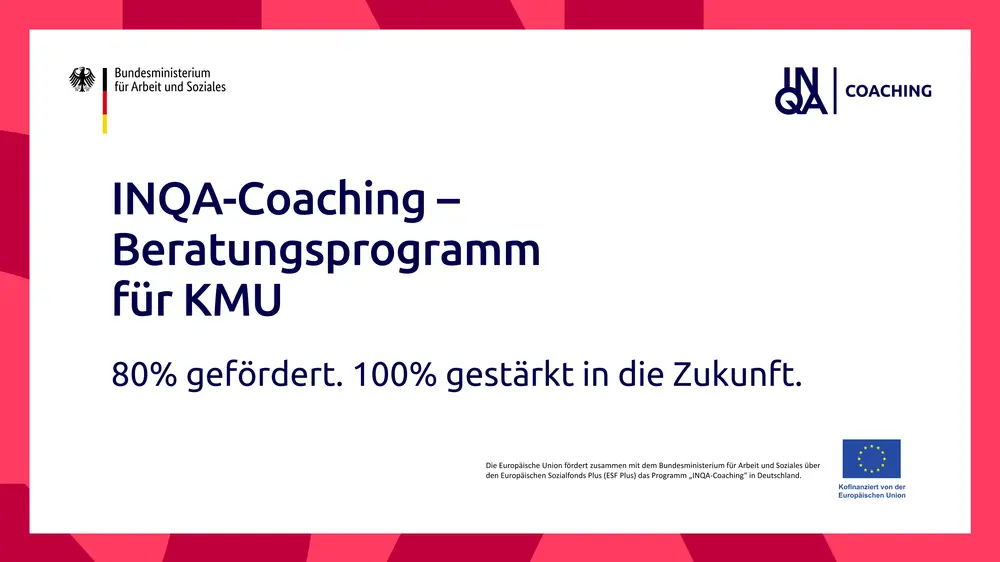 Das Coaching erfolgt anhand einer agilen Methode, die Unternehmensführung und Beschäftigte in einen gemeinsamen Lern- und Entwicklungsprozess einbindet. INQA-Coaching ist niedrigschwellig zugänglich für alle Unternehmen mit weniger als 250 Beschäftigten. Unternehmen tragen dabei nur 20 % der Beratungskosten selbst, 80 % werden übernommen. Das Programm läuft bis Ende 2027 und wird aus Mitteln des Europäischen Sozialfonds Plus (ESF Plus) und des Bundesministeriums für Arbeit und Soziales (BMAS) finanziert.