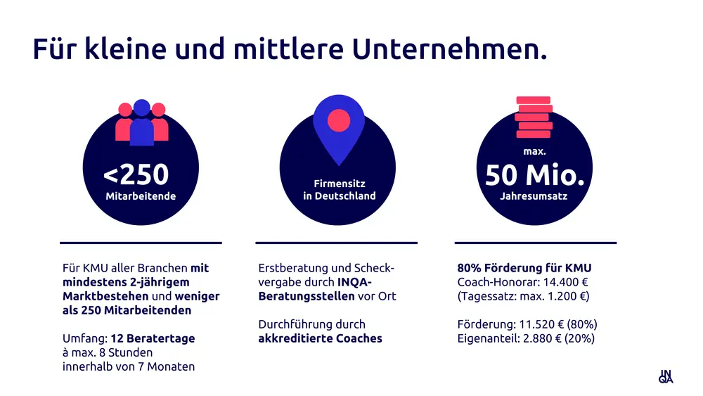 Das INQA-Coaching richtet sich an kleine und mittlere Unternehmen mit Sitz und Arbeitsstätte in Deutschland. Förderfähig sind Unternehmen, die im letzten abgeschlossenen Geschäftsjahr:
